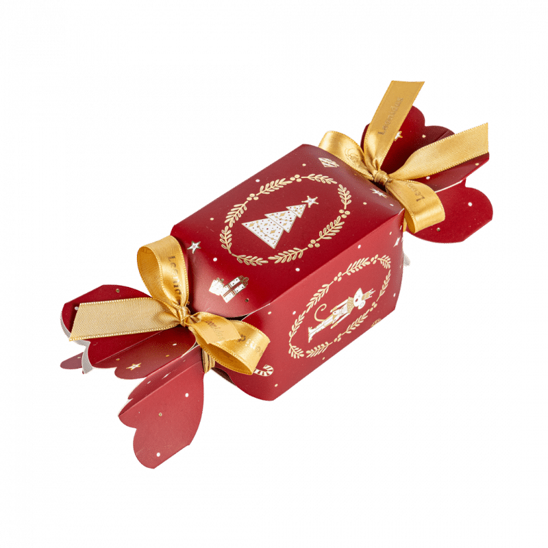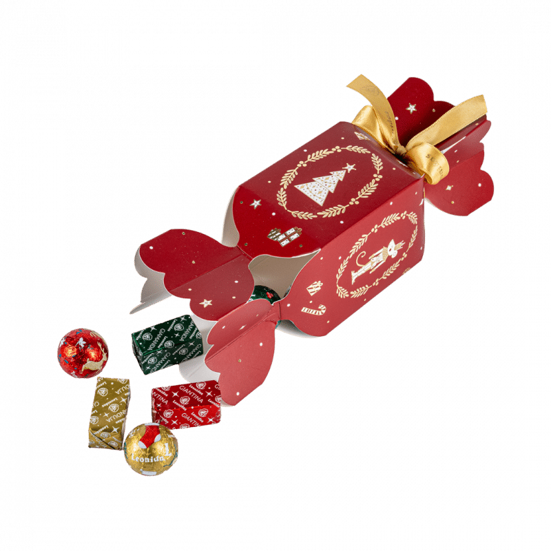 Candy Noel Leonidas este o cutie burgundy în formă de bomboană, decorată cu modele aurii și albe de Crăciun și legată manual cu fundițe. Conține un asortiment de 150g de praline belgiene Leonidas, fiind un cadou de sărbători perfect pentru cei dragi.