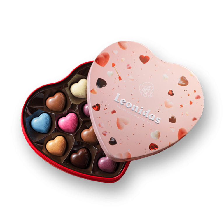- Conține 12 praline inimioare asortate din ciocolată belgiană premium Leonidas