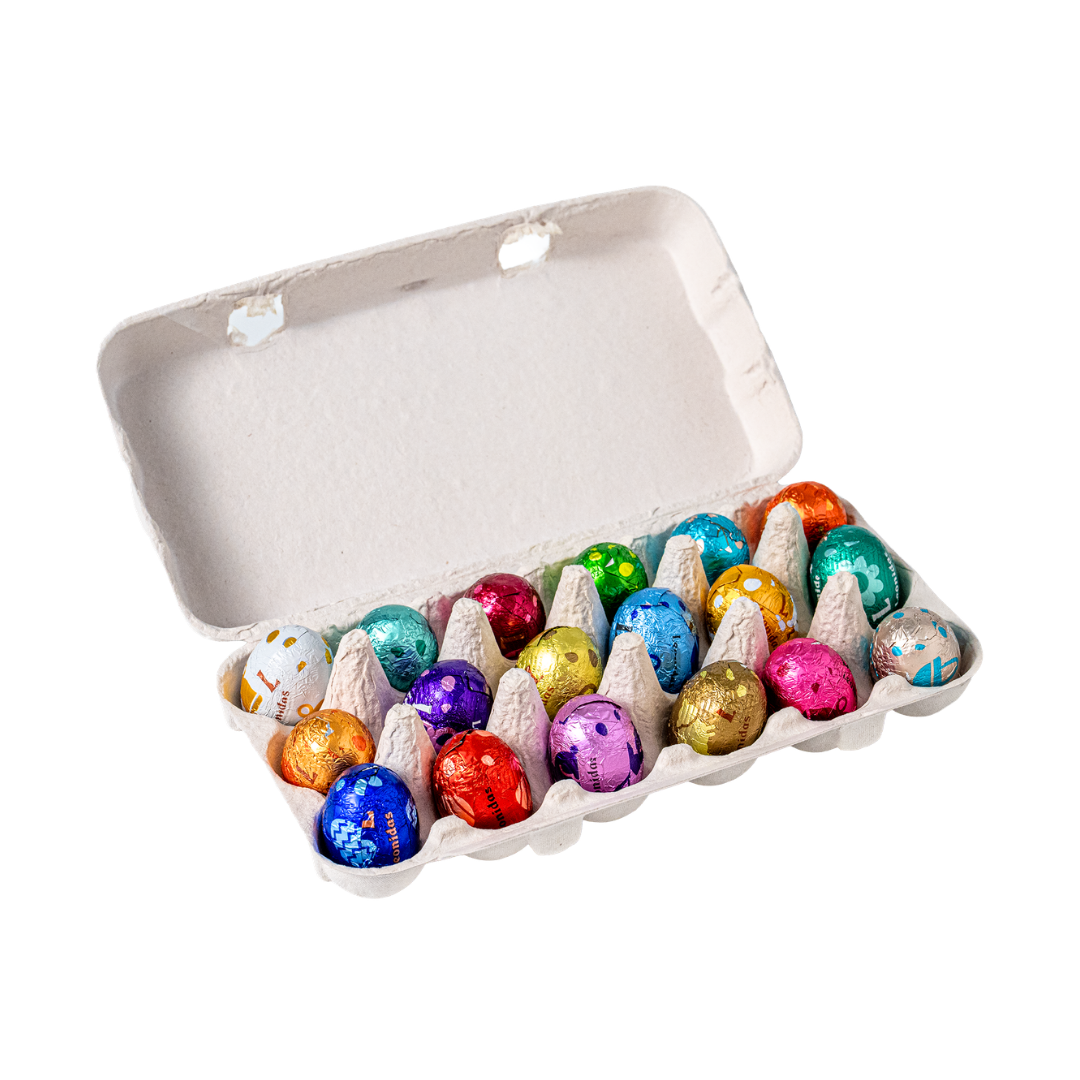 • 18 mini-ouă din ciocolată belgiană de înaltă calitate