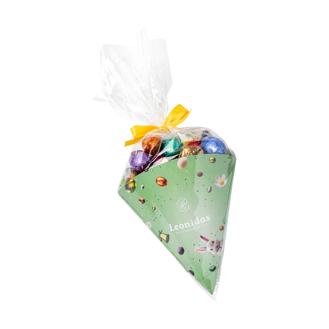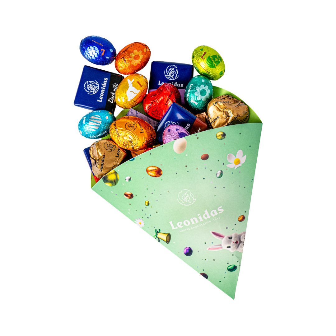 Con Green Paște Leonidas, verde, umplut cu 240g de mini-ouă, praline ambalate și mini-tablete. Poza este cu titlu de prezentare iar pralinele pot diferi. Pungă cadou Leonidas și hârtie mătase incluse.