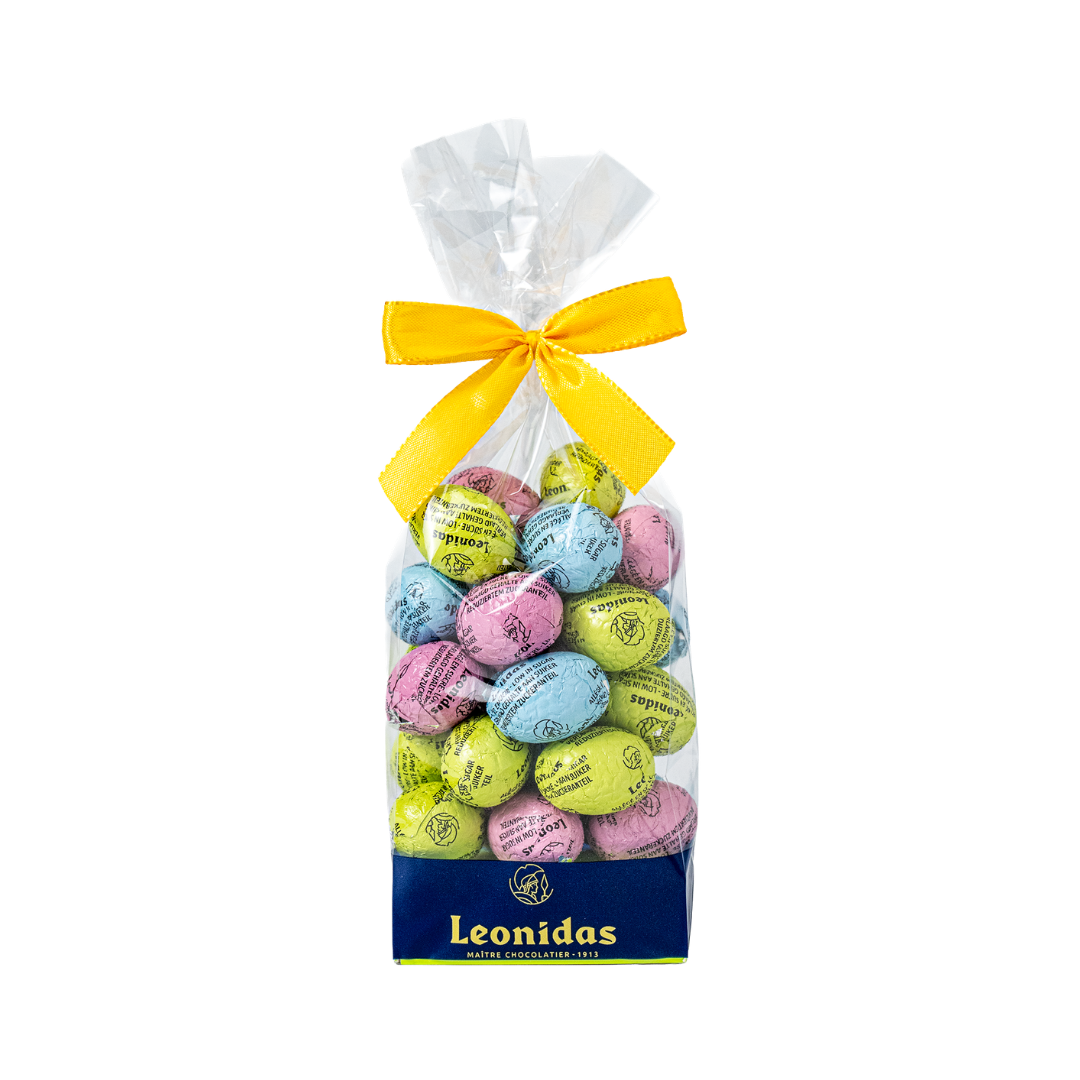 Mini ouă de Paști Leonidas 250g, cu conținut redus de zahăr, din ciocolată cu lapte, neagră și albă. Pungă cadou și hârtie mătase incluse. Fotografia este cu titlu de prezentare.