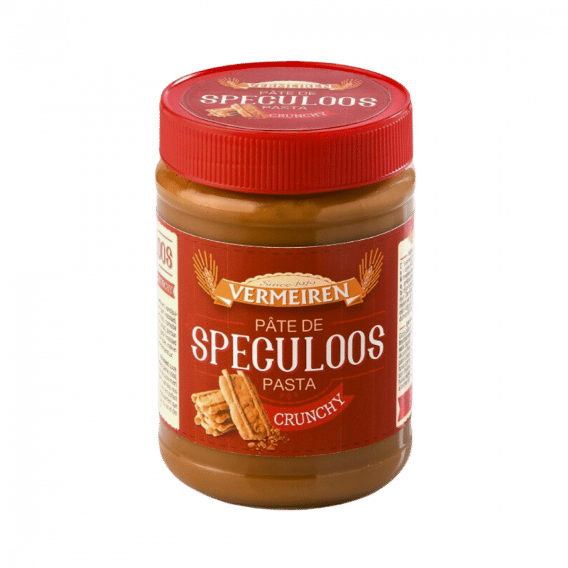 Crema Vermeiren cu biscuiți speculoos și bucățele crocante de biscuiți. – un deliciu belgian clasic, gata să-ți parfumeze fiecare dimineață sau desert.