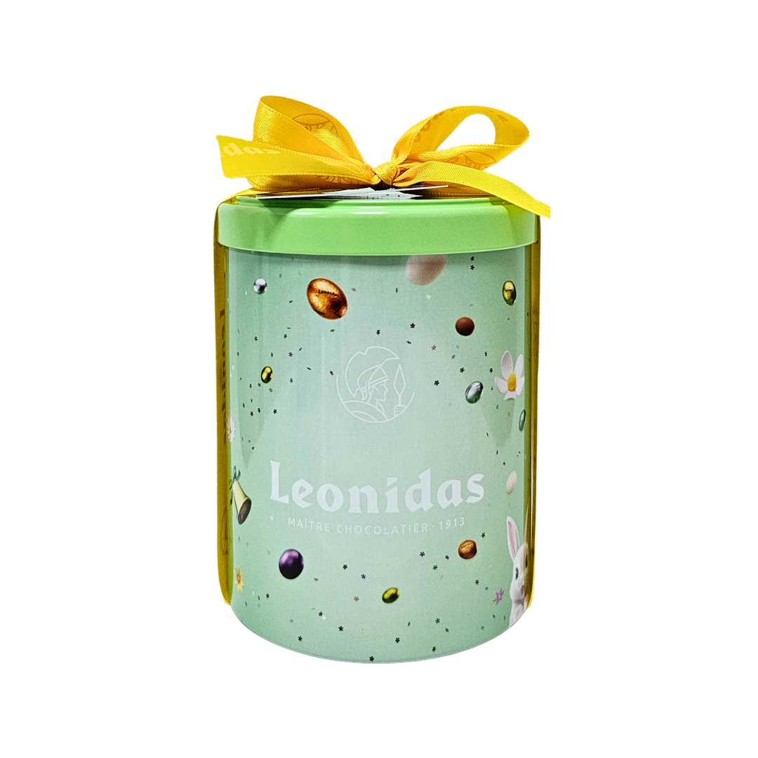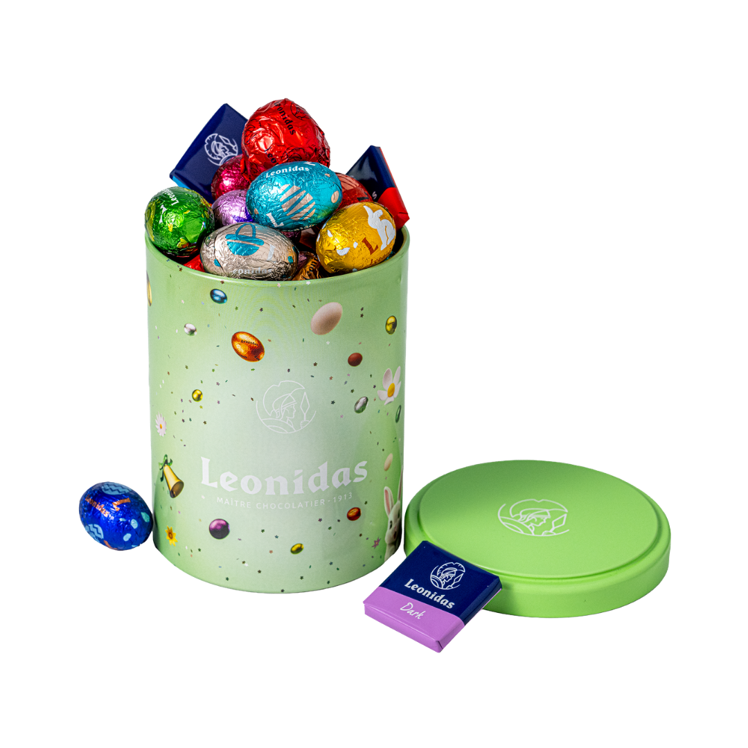 Tube Metal M Paste este o cutie cilindrică metalică, ce conține mini-ouă umplute cu diverse creme, din ciocolată cu lapte, neagră și albă și praline ambalate. Pungă cadou Leonidas și hârtie mătase incluse.